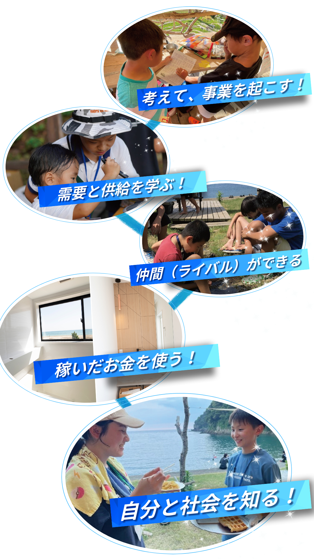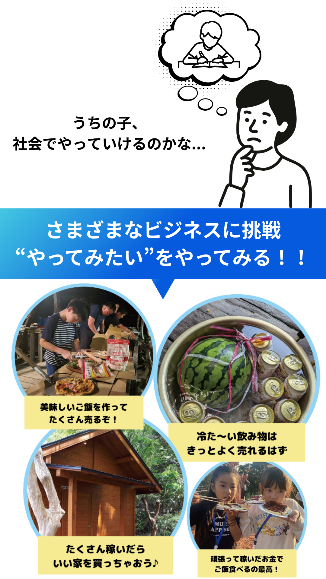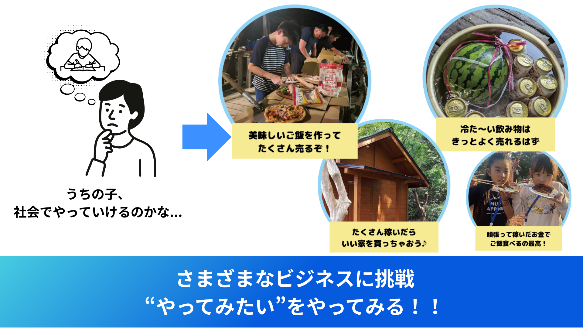 一般的な自然体験教室とは違い、子ども達は「自分の力をどうビジネスに活かすか」を全て自力で考え、挑戦します。失敗もありますが、復帰のヒントが随所にあり何度でも立ち上がれます。