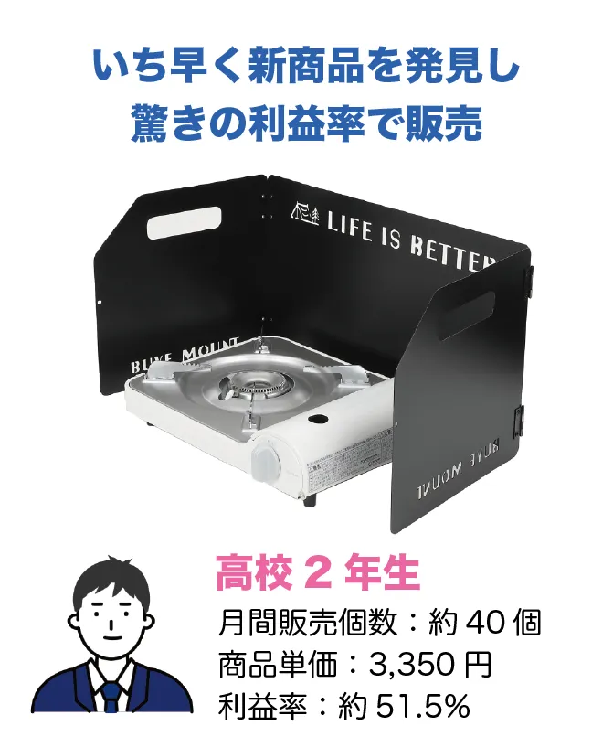 利益や損失が本当に出ます- 本物のお金を使いビジネスを進めるため、売れた時の喜びや失敗した時の悔しさはひとしおです。商品価格の調査や事前の経費計算などもしっかり行うため、ビジネスを数字で捉える力が身についていきます。